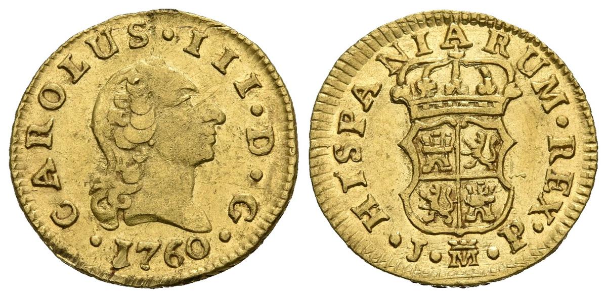 CARLOS III (1759-1788). 1/2 Escudo (Au.1,76g/15mm). 1760. Madrid JP. (Cal-2019-1242). Corona lisa. EBC/EBC+.