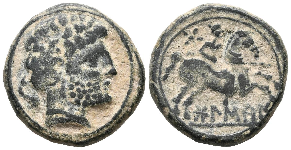 BOLSCAN (Huesca). As. (Ae. 10,18g/20mm). 180-20 a.C. (FAB-1918). Anv: Cabeza masculina barbada a derecha, detrás delfín. Rev: Jinete con lanza a derecha, encima estrella, debajo leyenda ibérica: BoLSCaN. MBC-.