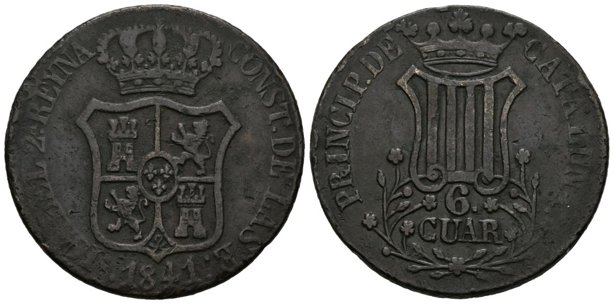 ISABEL II (1833-1868). 6 Cuartos. (Ae. 13,78g/32mm). 1841. Barcelona. (Cal-2019-22). Flores de cinco pétalos. MBC.