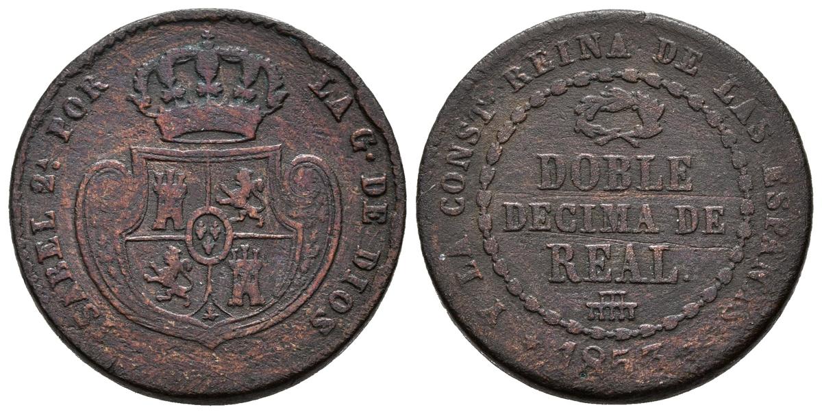 ISABEL II (1833-1868). Doble Décima de Real. (Ae. 7,03g/22mm). 1853. Segovia. (Cal-2019-148). MBC-. Oxidaciones. Escasa.