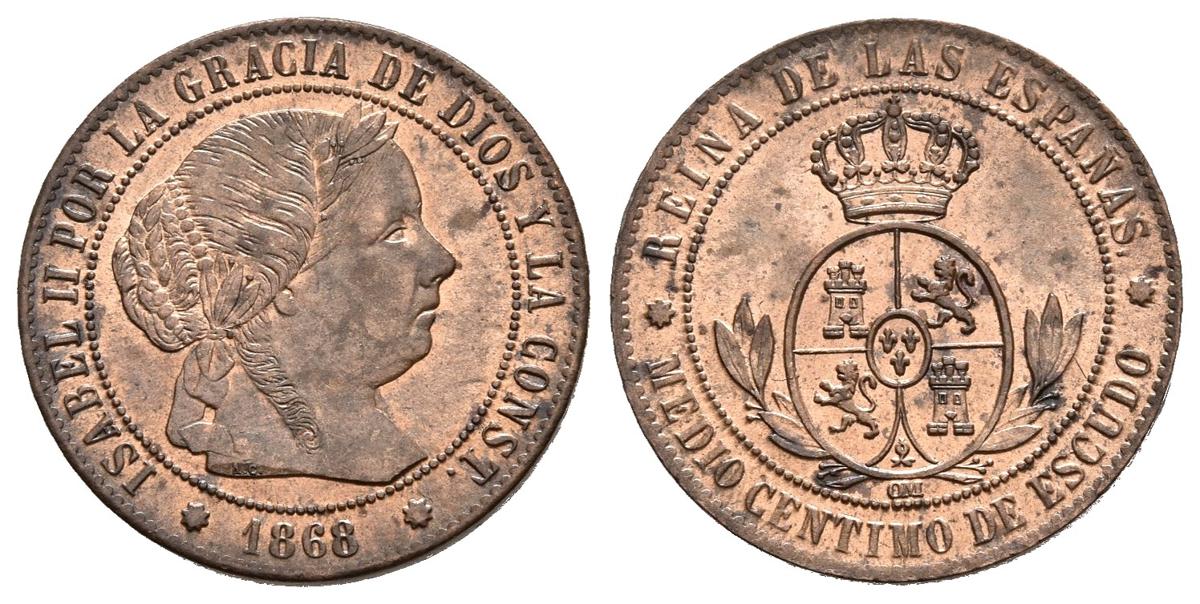 ISABEL II (1833-1868). 1/2 Céntimo de Escudo (Ae. 1,25g/16mm). 1868. Barcelona. OM. (Cal-2019-201). SC-. Brillo original.