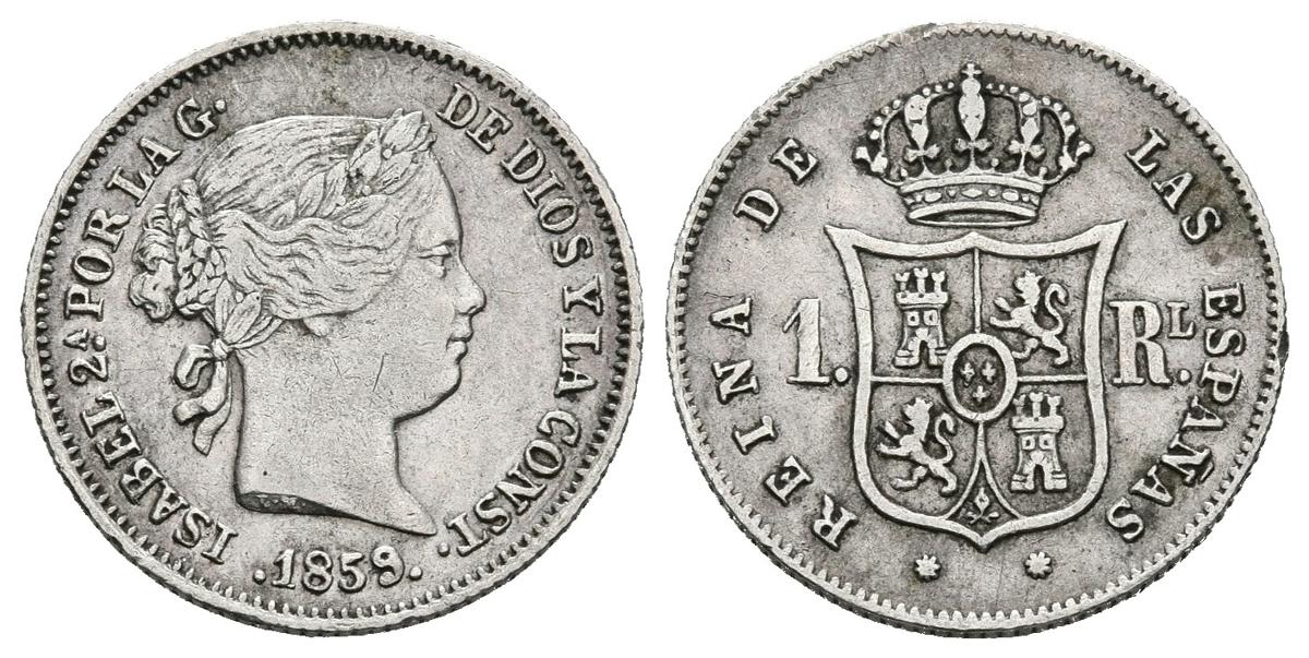 ISABEL II (1833-1868). 1 Real. (Ar. 1,31g/15mm). 1859. Barcelona. (Cal-2019-283). MBC+. Escasa.