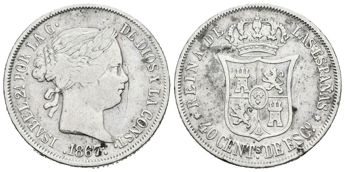 ISABEL II (1833-1868). 40 Céntimos de Escudo. (Ar. 5,04g/23mm). 1867. Madrid. (Cal-2019-502). MBC-/MBC.