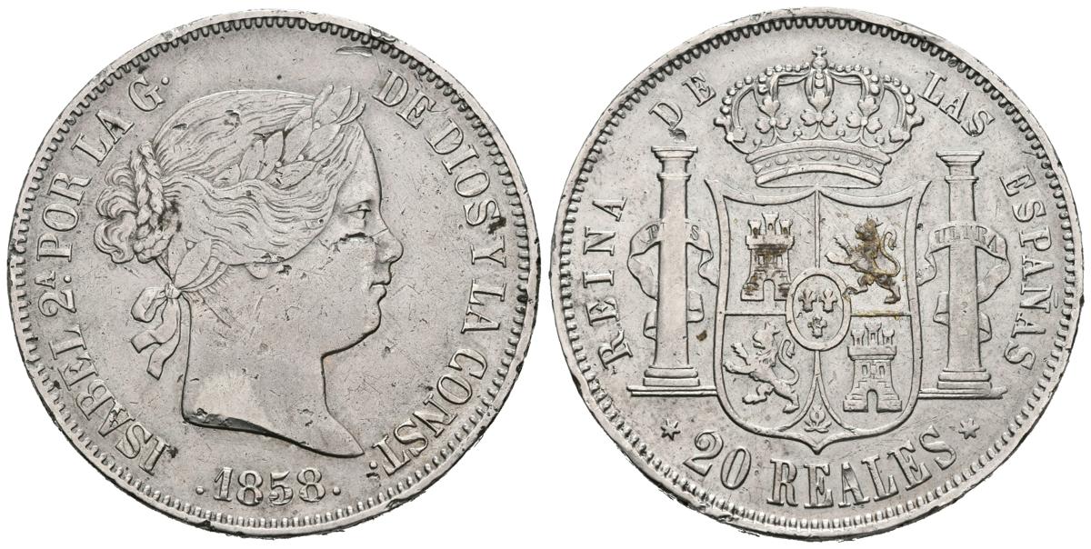 ISABEL II (1833-1868). 20 Reales. (Ar. 25,83g/37mm). 1858. Madrid. (Cal-2019-615). MBC-/MBC. Marcas en anverso.