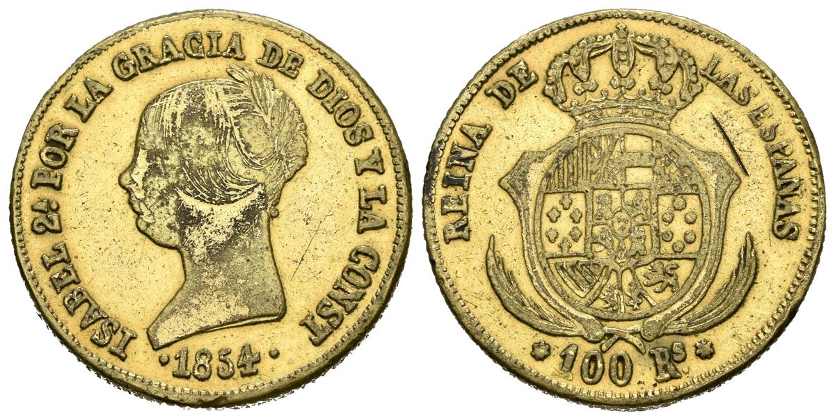ISABEL II (1833-1868). 100 Reales (Metal-dorado. 5,35g/22mm). 1854. Madrid. (Cal-2019-779). Falsa de época. MBC-/MBC.
