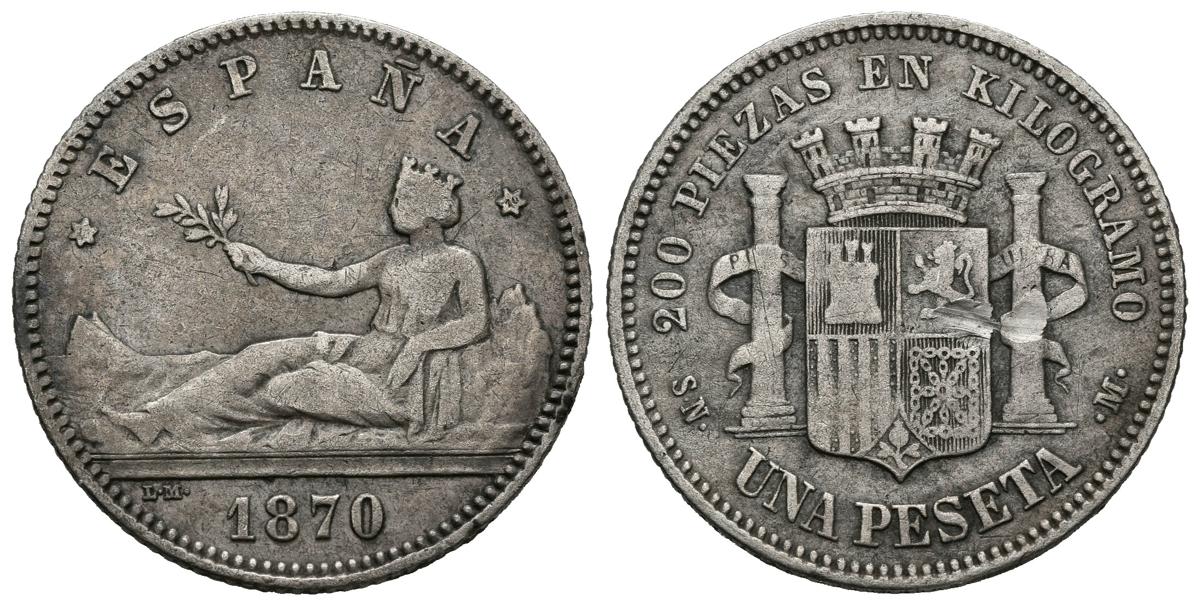 GOBIERNO PROVISIONAL (1868-1871). 1 Peseta. (Ar. 4,82g/23mm). 1870 *18-70. Madrid SNM. (Cal-2019-18). Primera estrella poco visible. MBC.