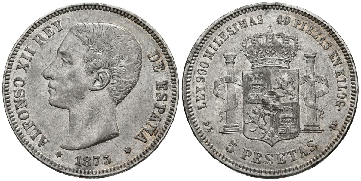 ALFONSO XII (1874-1885). 5 Pesetas. (Ar. 24,76g/37mm). 1875 *18-75. Madrid. DEM. (Cal-2019-35). EBC-. Marquitas.