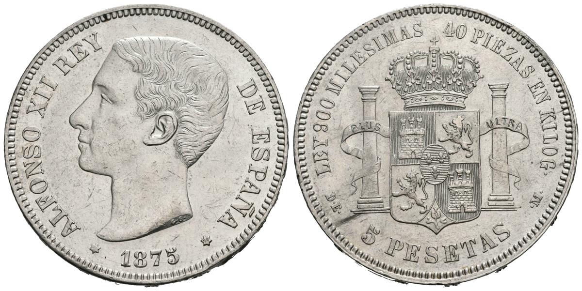ALFONSO XII (1874-1885). 5 Pesetas. (Ar. 25,12g/37mm). 1875 *18-75. Madrid DEM. (Cal-2019-35). EBC. Marquitas. Golpecito en el canto. Primera estrella no visible. Escasa.