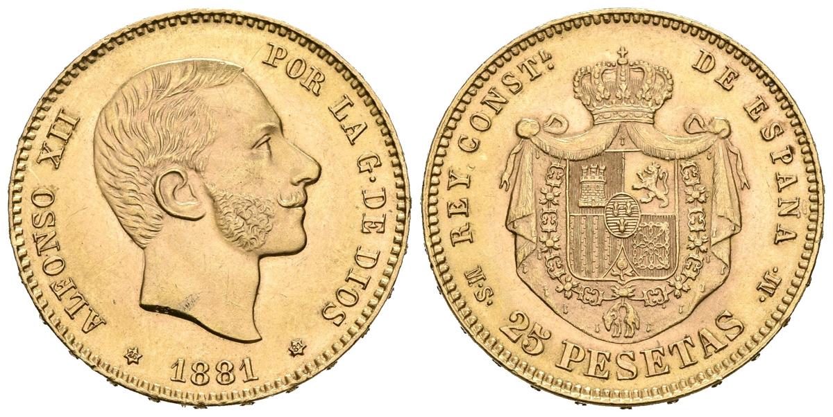 ALFONSO XII (1874-1885). 25 Pesetas. (Au. 8,07g/24mm). 1881 *18-81. Madrid MSM. (Cal-2019-82). EBC. Ligerísimas marquitas.