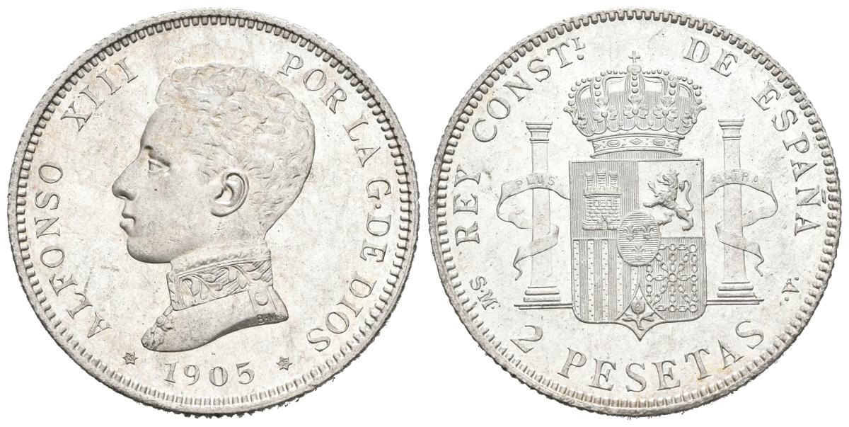 ALFONSO XIII (1885-1931). 2 Pesetas. (Ar. 10,03g/27mm). 1905 *19-05. Madrid SMV. (Cal-2019-88). EBC+. Precioso brillo original.