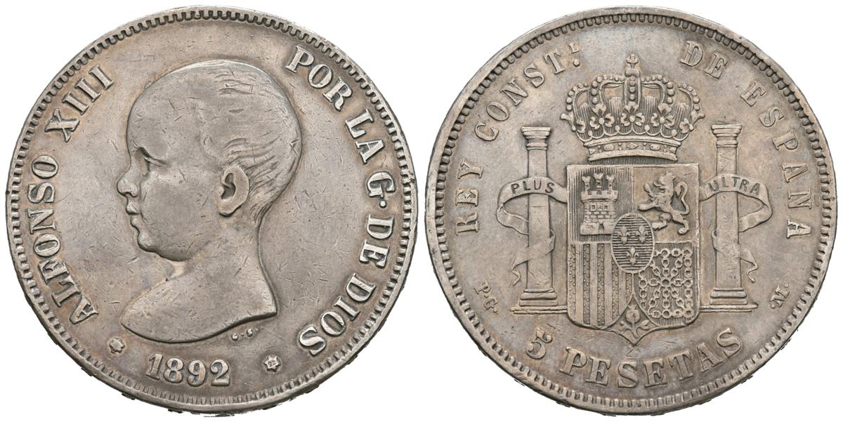 ALFONSO XIII (1885-1931). 5 Pesetas. (Ar. 24,83g /37mm). 1892 *18-92. Madrid PGM. (Cal-2019-99). MBC/MBC+. Primera estrella poco visible.