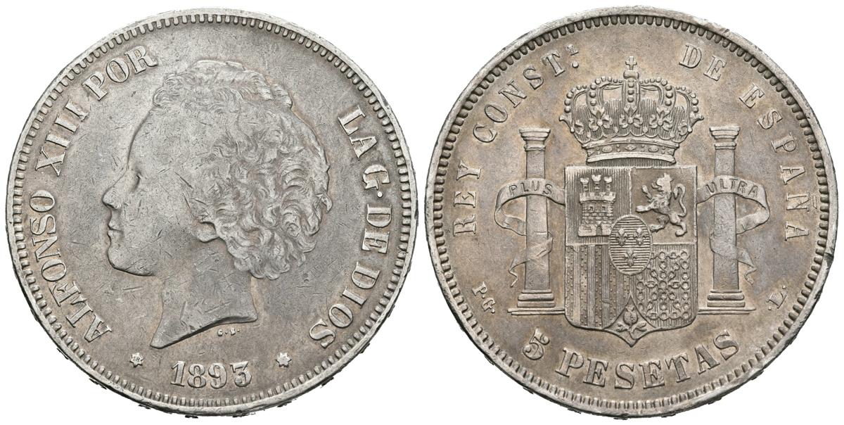 ALFONSO XIII (1885-1931). 5 Pesetas. (Ar. 25,00g /37mm). 1893 *18-93. Madrid PGL. (Cal-2019-102). MBC/MBC+. Segunda estrella no visible.