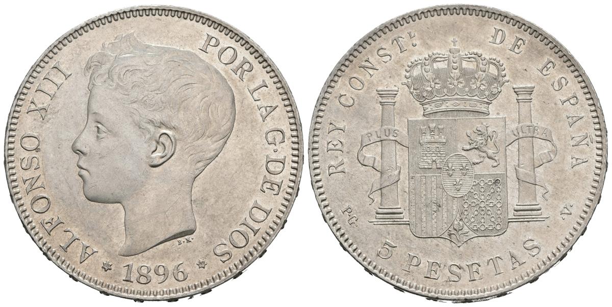 ALFONSO XIII (1885-1931). 5 Pesetas. (Ar. 24,99/37mm). 1896 *18-96. Madrid PGV. (Cal-2019-106). SC-. Brillo original.