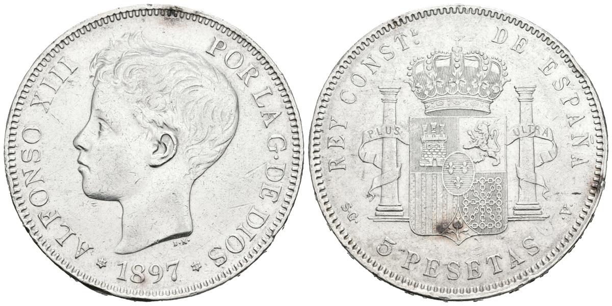 ALFONSO XIII (1885-1931). 5 Pesetas. (Ar. 24,80g /37mm). 1897 *18-97. Madrid SGV. (Cal-2019-107). EBC-. Limpiada. Marquitas. Golpecitos en el canto.