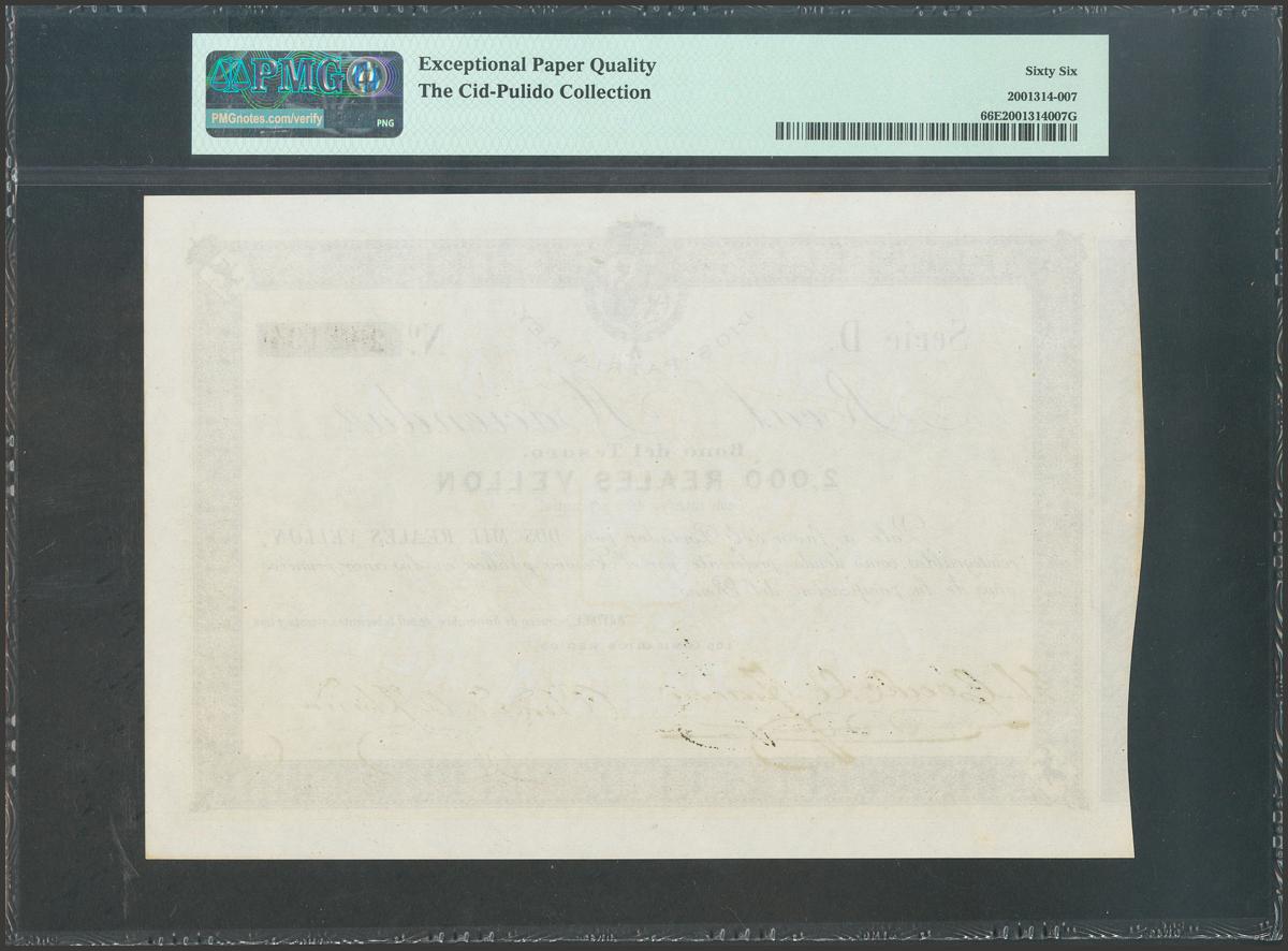 2000 Reales de Vellón. Emisión Carlista emitida en Bayona. 1 Noviembre 1873. Serie D. (Edifil 2017: 213). SC. Encapsulado PMG66EPQ.