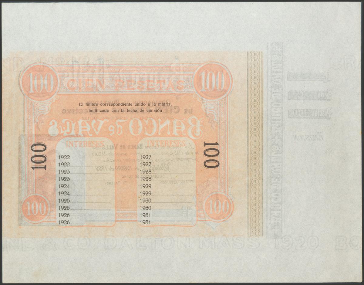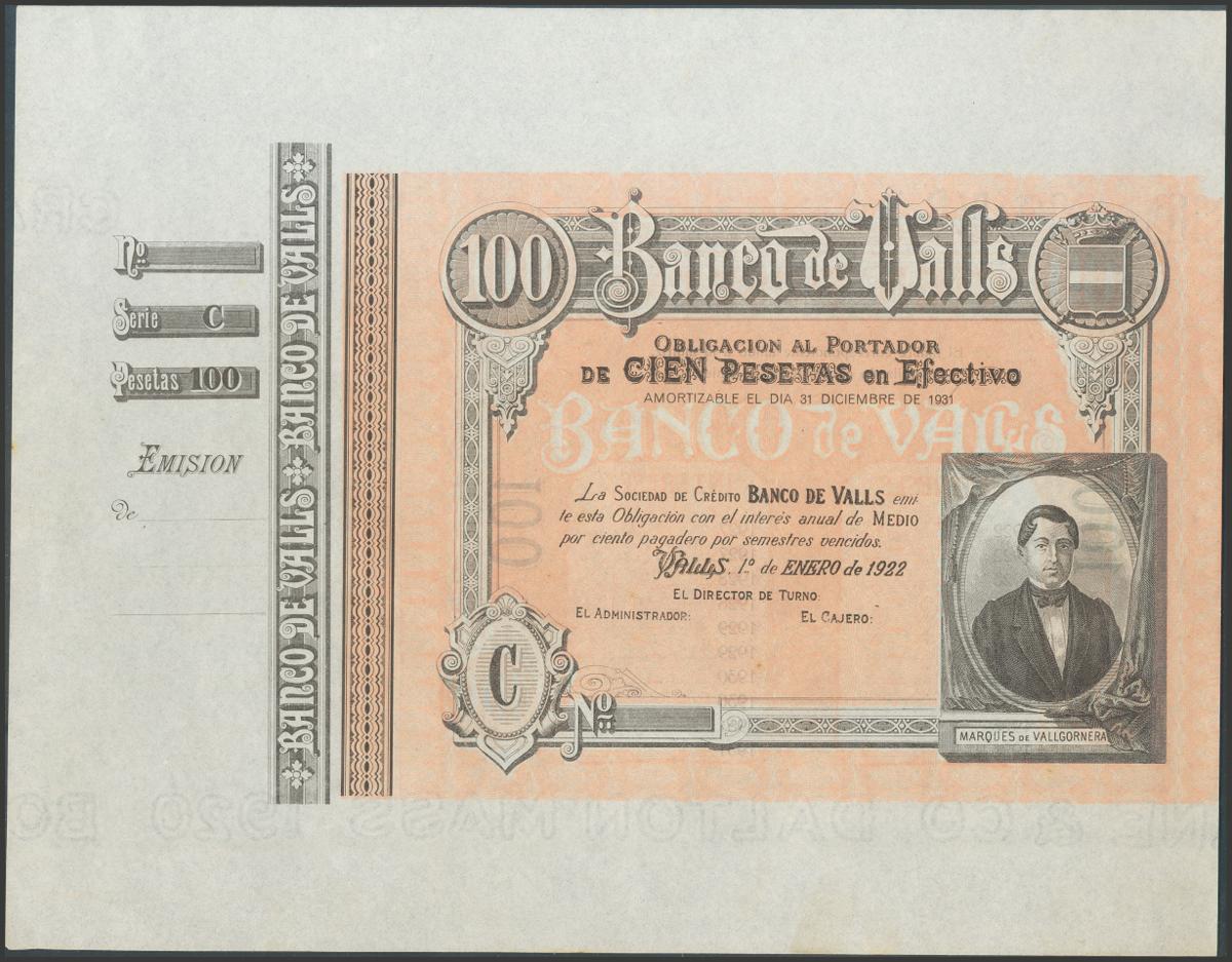 100 Pesetas. 1 de Abril de 1892. Banco de Valls. Serie C. (Ruiz y Alentorn: 927). SC-.