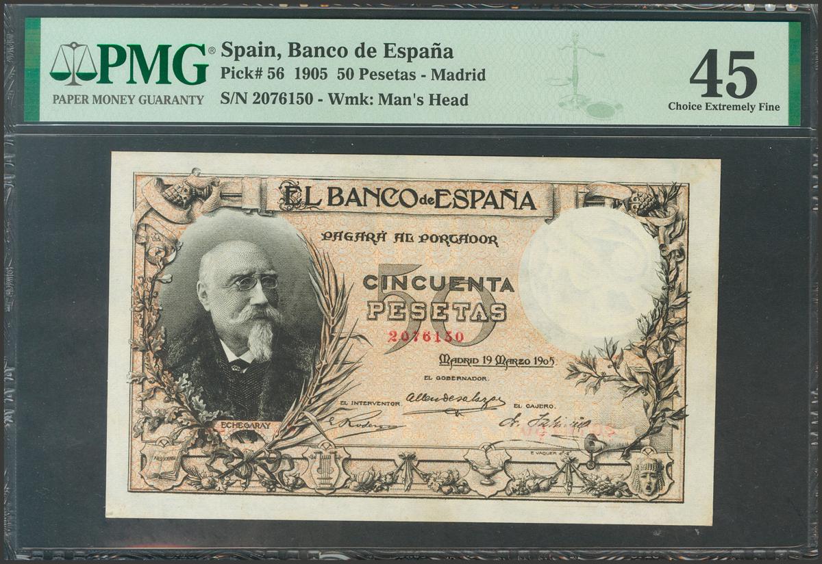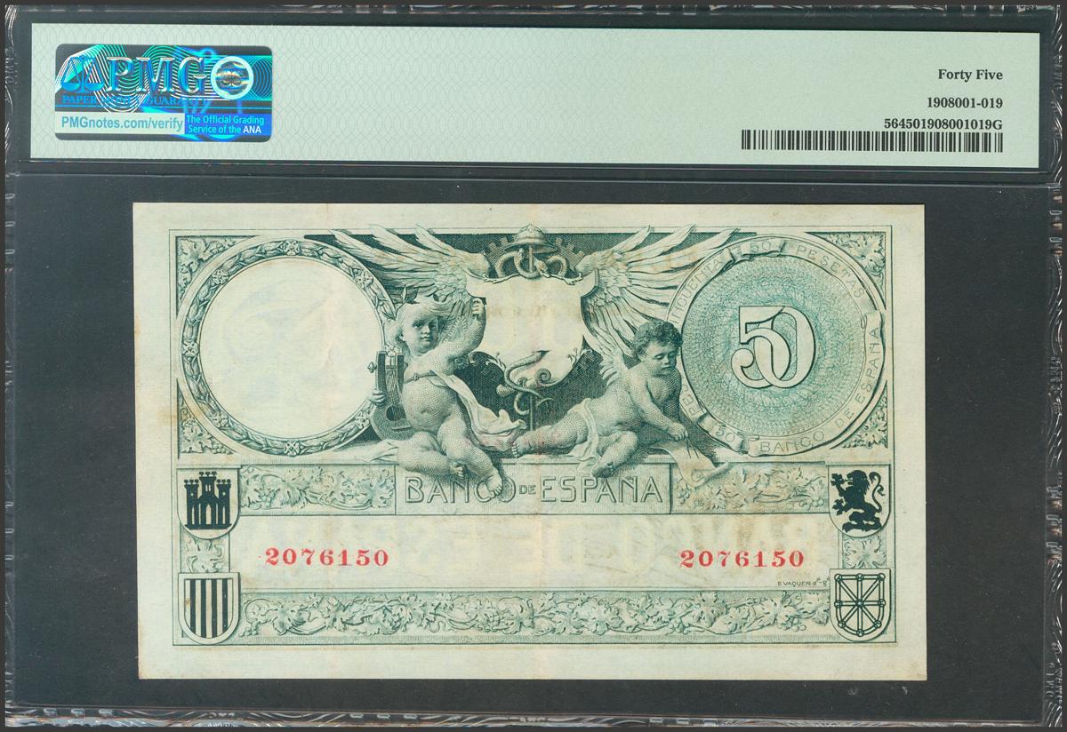 50 Pesetas. 19 de Marzo de 1905. Sin serie. (Edifil 2017: 312). Muy raro en esta aceptable calidad, especialmente para un billete clásico. EBC. Encapsulado PMG45. (para hacerse una idea de la rareza de este billete en esta calidad, PMG otorga a día 1 de Abril de 2021 la quinta mejor calificación a este billete junto a otros 2 billetes).