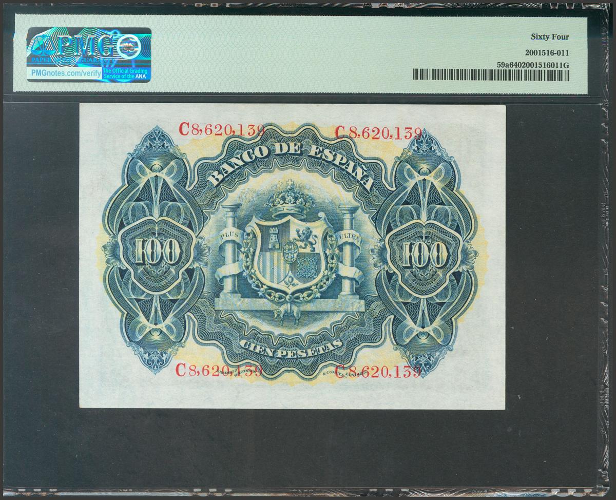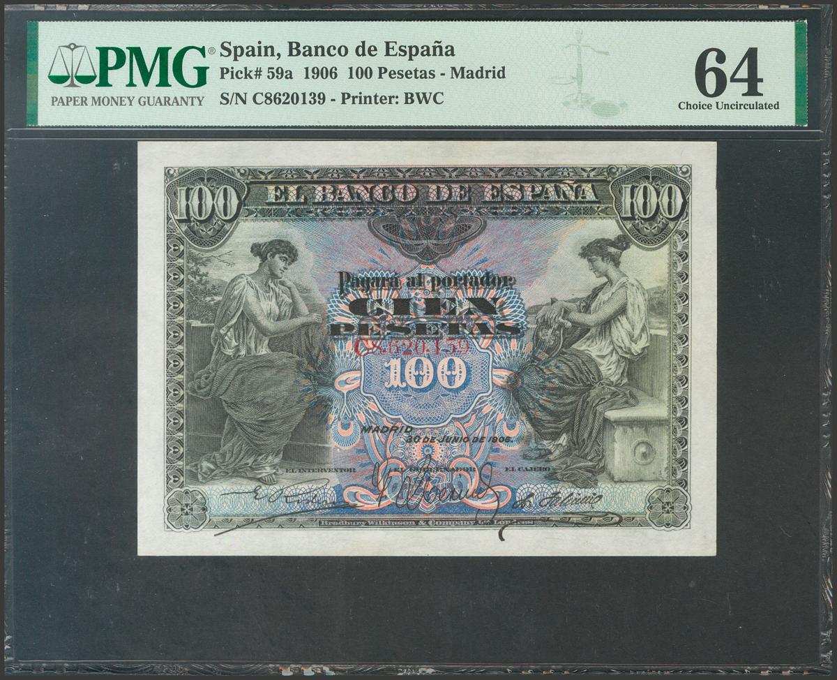 100 Pesetas. 30 de Junio de 1906. Serie C. (Edifil 2021: 313a). Raro en esta excepcional calidad. SC. Encapsulado PMG64 (para hacernos una idea de la rareza de este billete, a fecha 1 de Julio de 2021, este ejemplar ha sido graduado con la quinta mejor calificación junto a otros dos billetes).