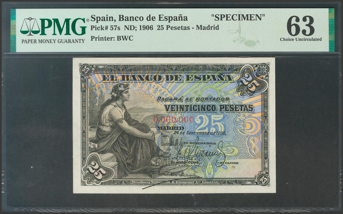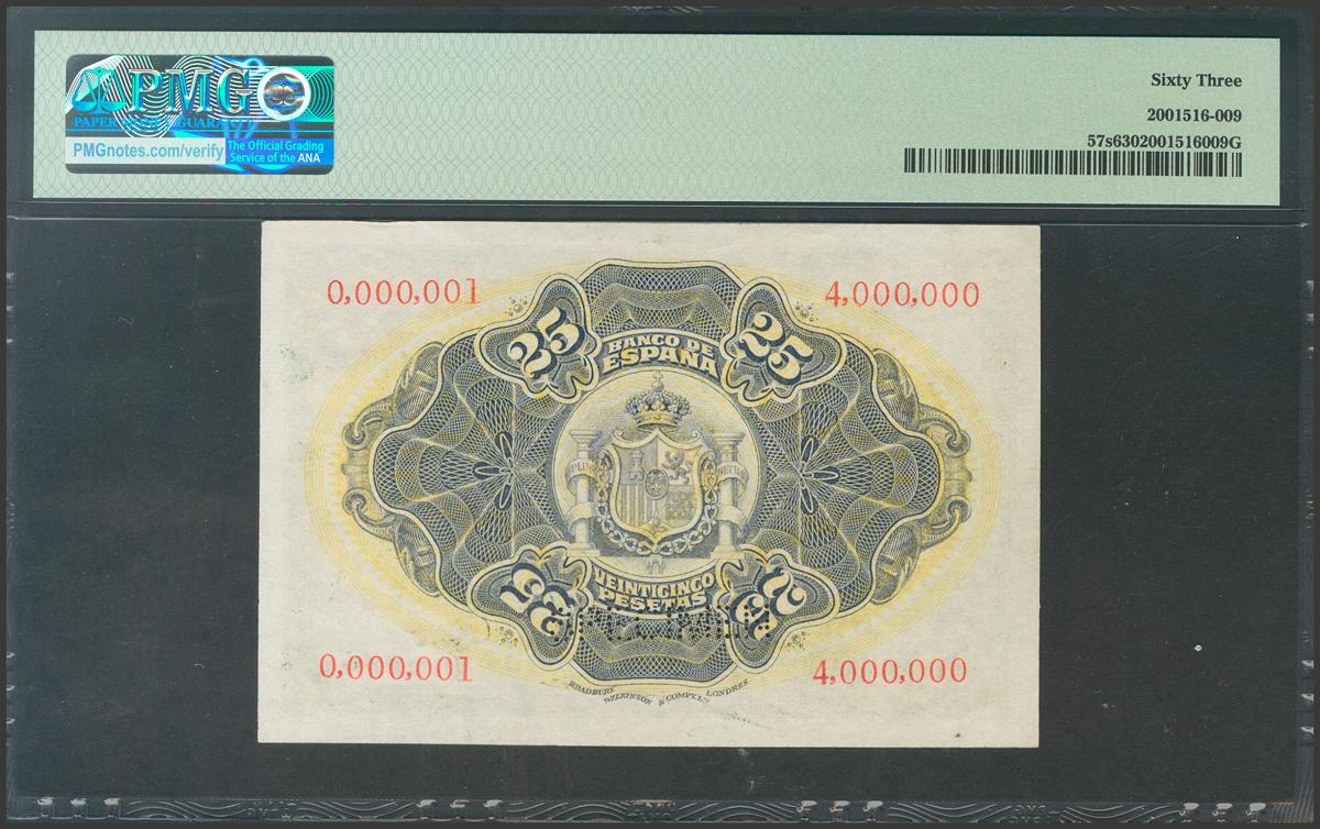 25 Pesetas. 24 de Septiembre de 1906. Nº0.000.000, taladrado SPECIMEN en el lugar de la firma del cajero y al dorso control de tirada desde el 0.000.001 al 4.000.000. (Edifil 2021: 314P). Raro, procedente del archivo Bradbury. SC. Encapsulado PMG63.