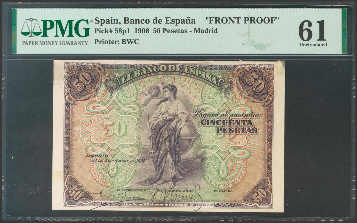 50 Pesetas. 24 de Septiembre de 1906. Prueba de color del anverso. (Edifil 2021: 315Pa). Rara. SC. Encapsulado PMG61.
