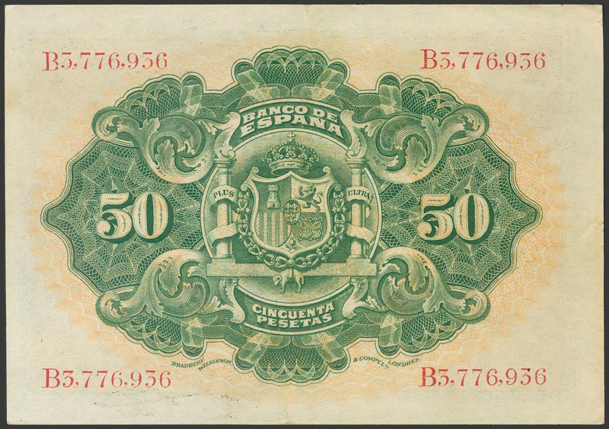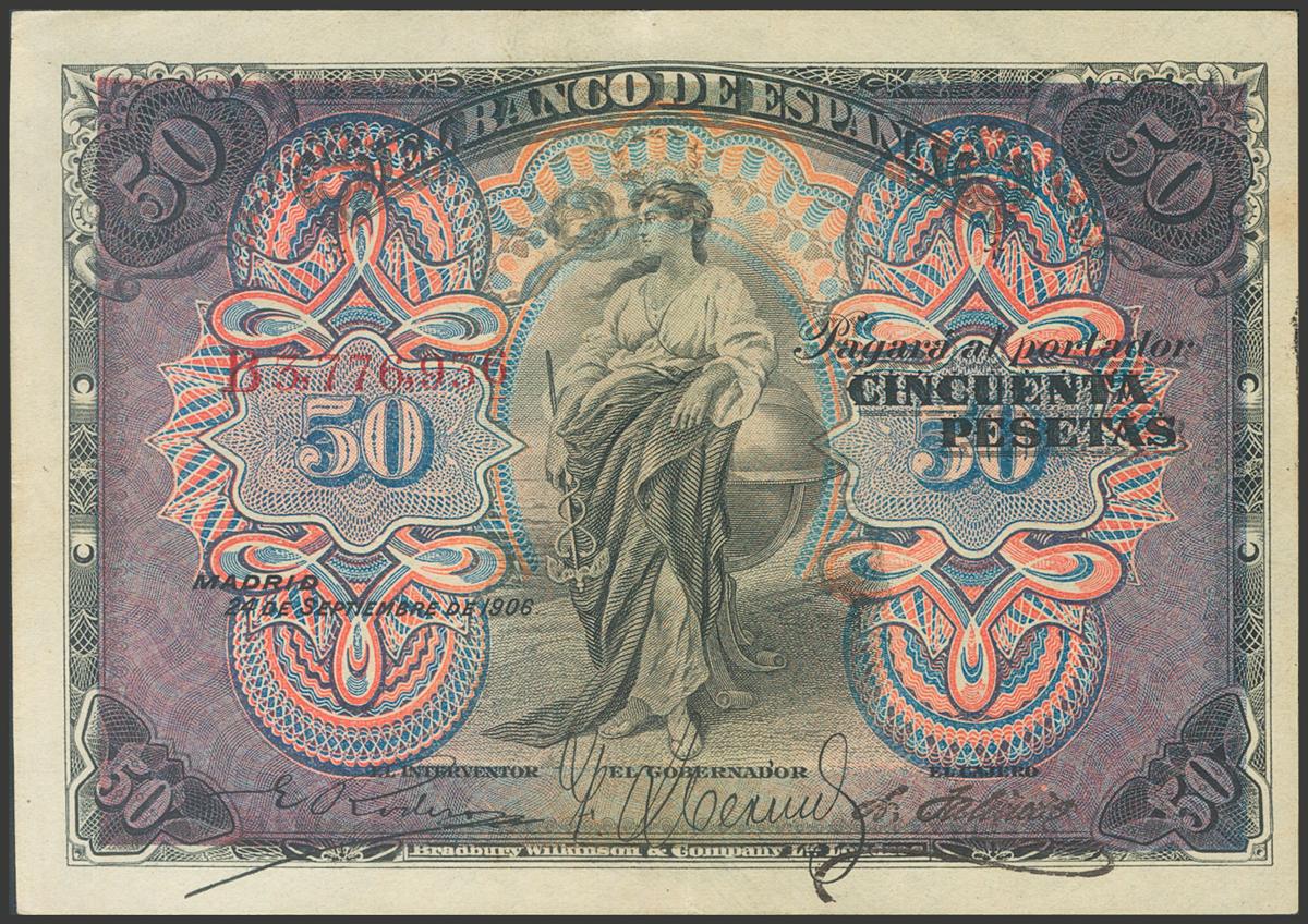 50 Pesetas. 24 de Septiembre de 1906. Serie B. (Edifil 2017: 315a). Conserva parte del apresto original. EBC-.