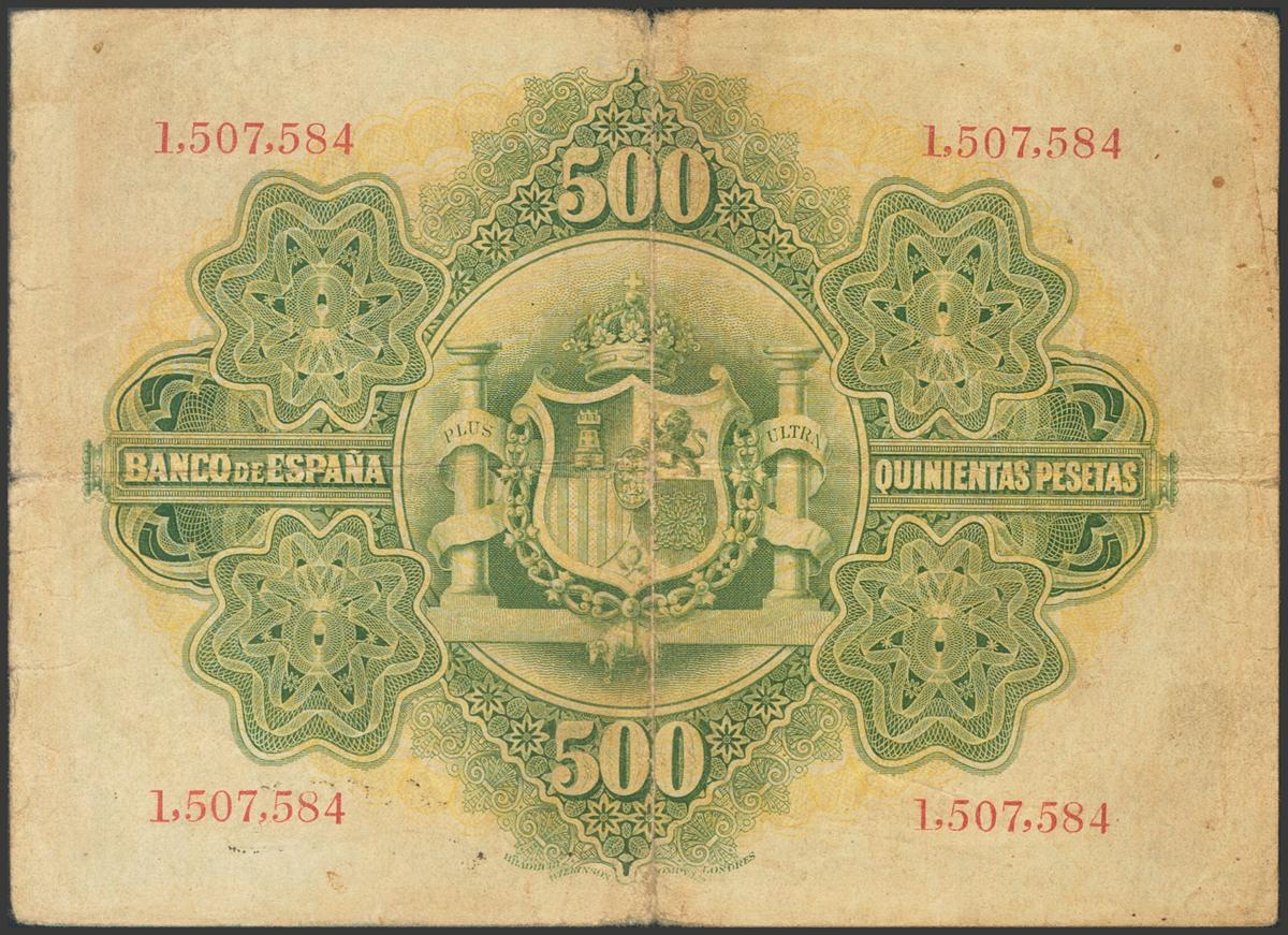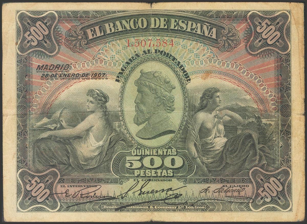 500 Pesetas. 28 de Enero de 1907. Sin serie. (Edifil 2017: 316). Raro, especialmente sin ninguna reparación, la mayoría de ejemplares han sido restaurados y en ocasiones ofrecen una mejor imagen que la original. MBC-.