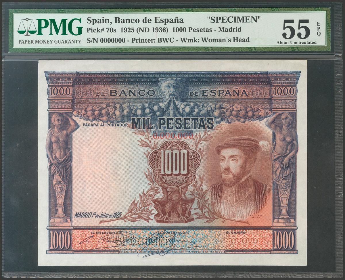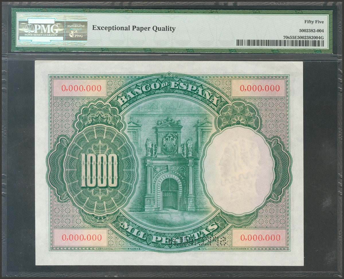 100 Pesetas. 1 de Julio de 1925. Sin serie, numeración 0.000.000 y taladrado SPECIMEN. (Edifil 2021: 324P). Raro, procedente del archivo Bradbury. EBC+. Encapsulado PMG55EPQ.
