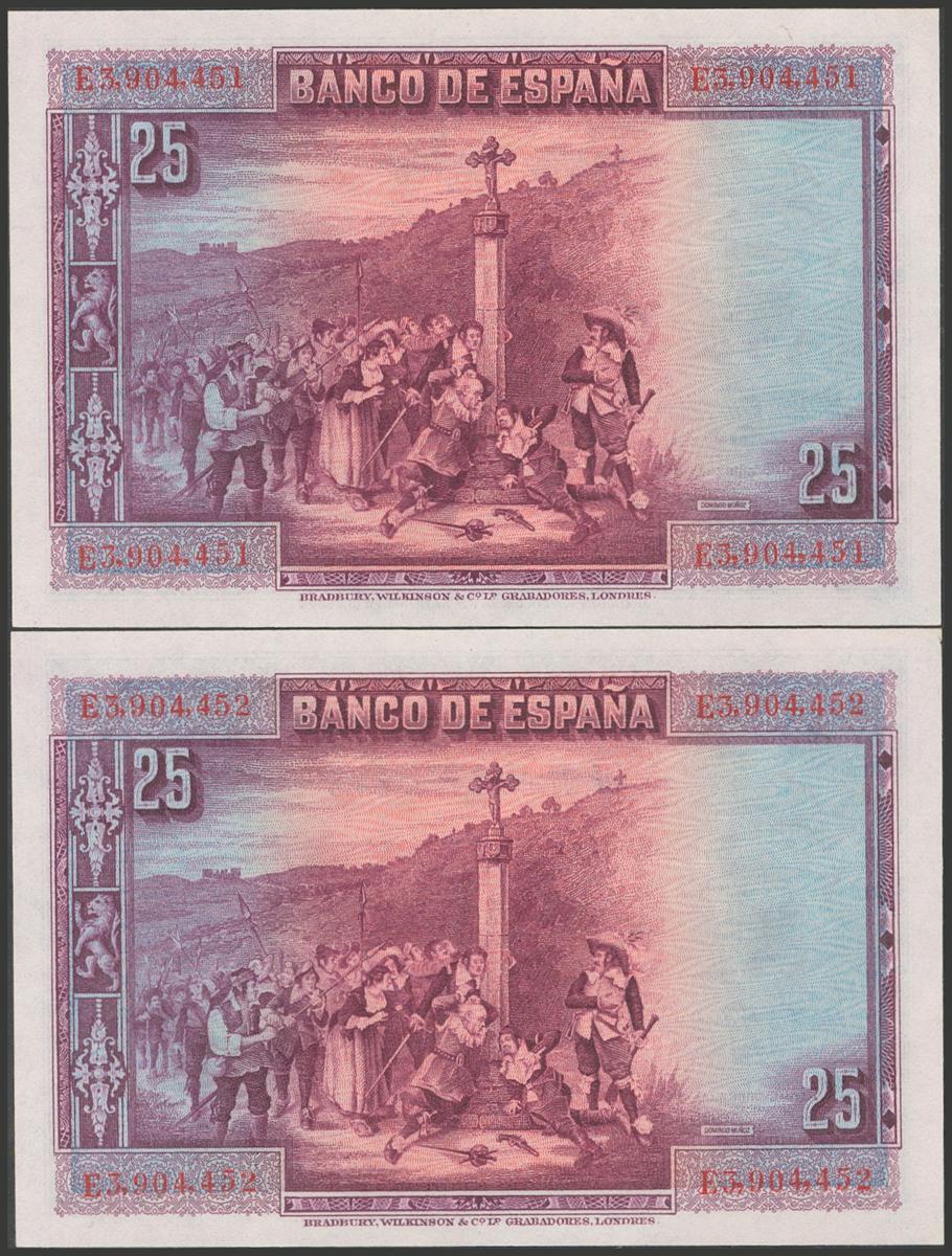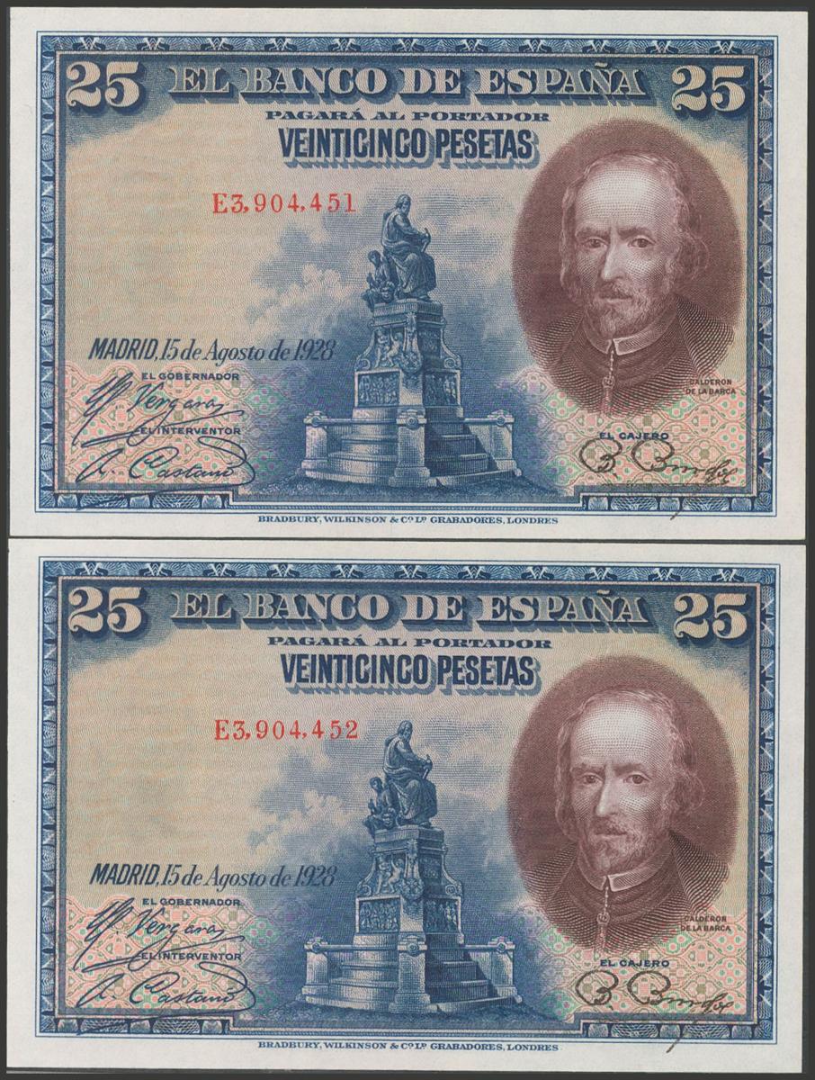 25 Pesetas. 15 de Agosto de 1928. Pareja correlativa. Serie E. (Edifil 2017: 353). Conserva todo el apresto original. SC.