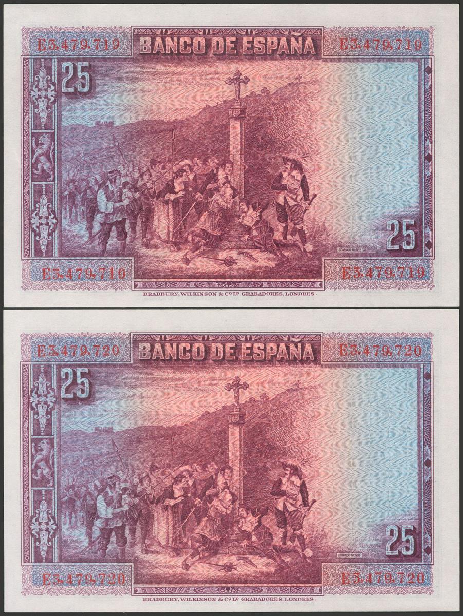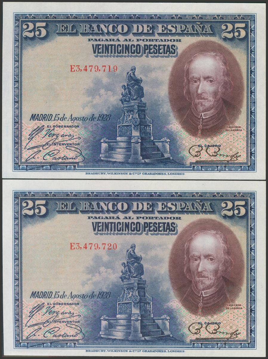 25 Pesetas. 15 de Agosto de 1928. Pareja correlativa. Serie E. (Edifil 2017: 353). Apresto original. EBC+.
