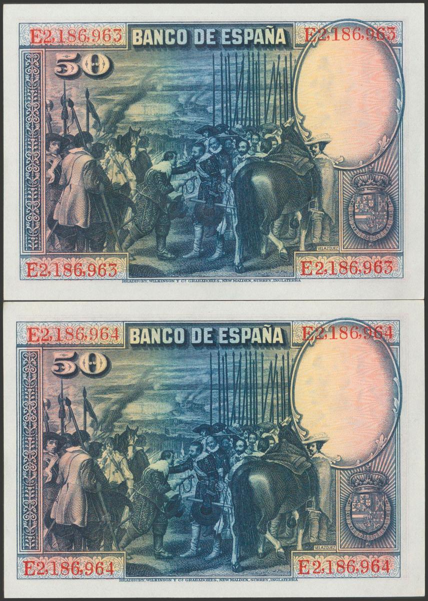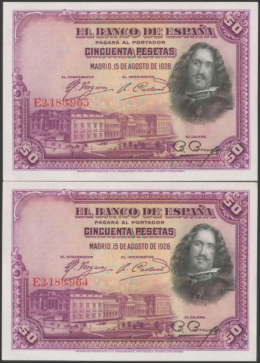 50 Pesetas. 15 de Agosto de 1928. Pareja correlativa. Serie E. (Edifil 2017: 354). Apresto original. SC.