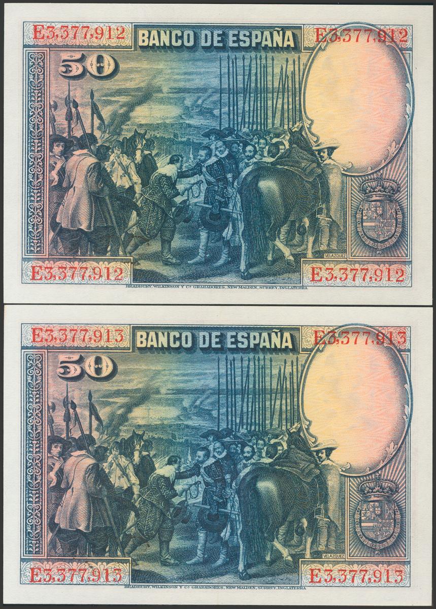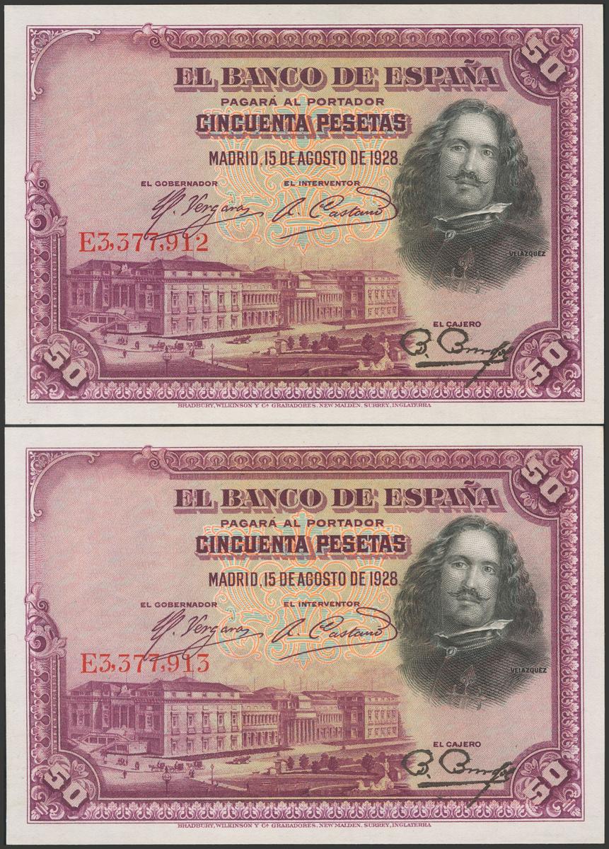50 Pesetas. 15 de Agosto de 1928. Pareja correlativa. Serie E. (Edifil 2017: 354). Apresto original. EBC+.
