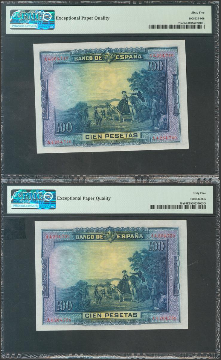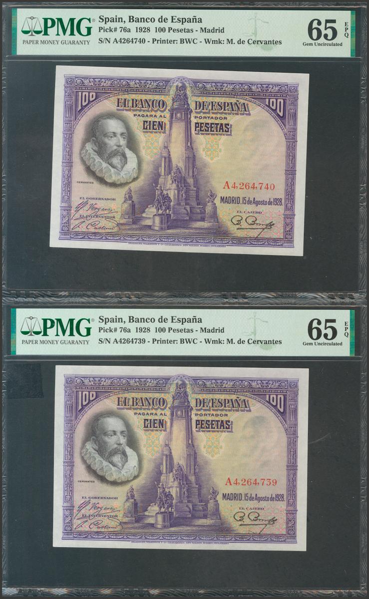 100 Pesetas. 15 de Agosto de 1928. Pareja correlativa. Serie A. (Edifil 2017: 355a). Conserva todo el apresto original. SC. Encapsulados PMG65EPQ, ambos.