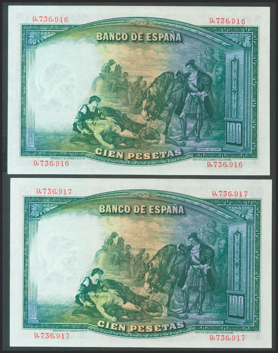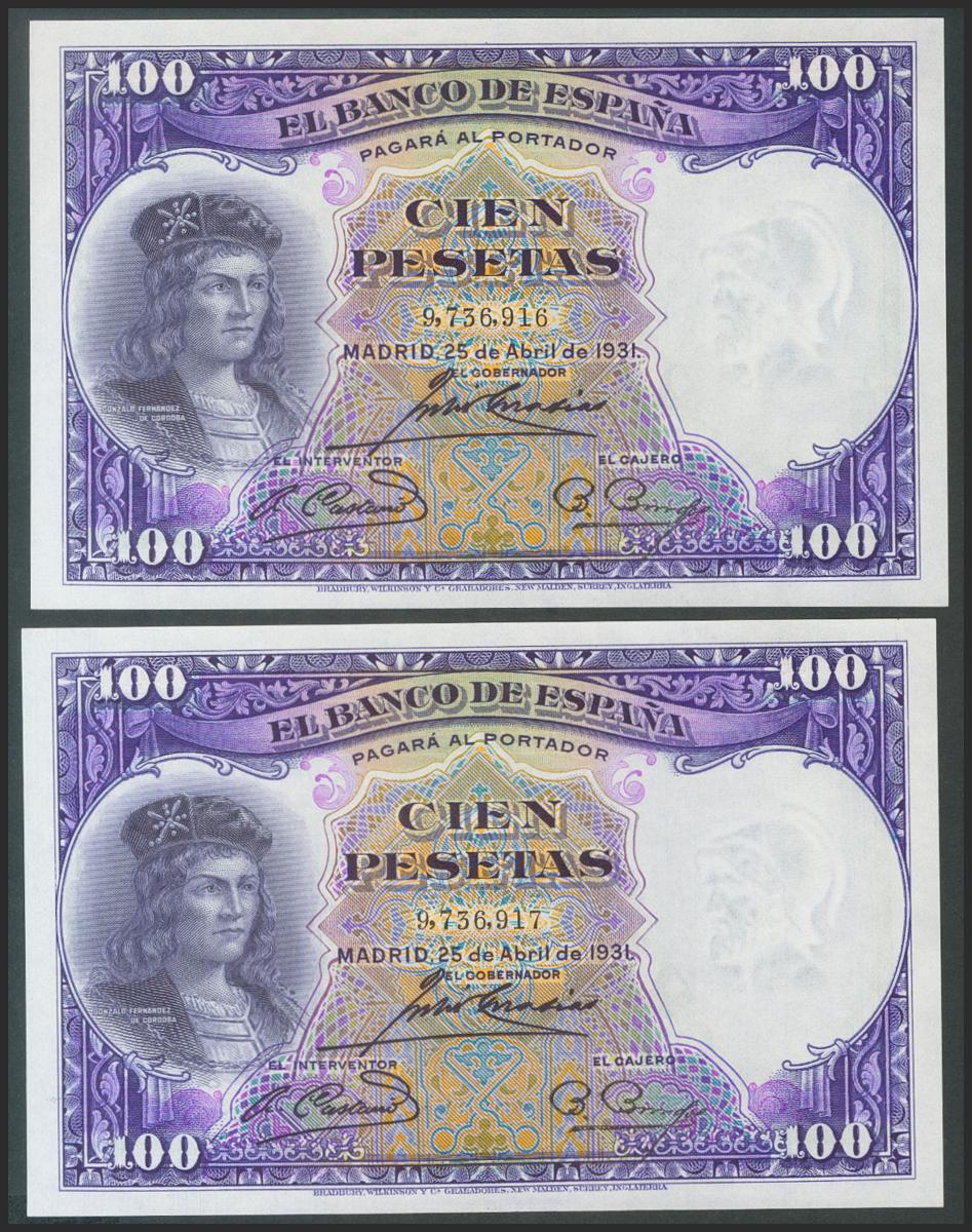 100 Pesetas. 25 de Abril de 1931. Pareja correlativa. Sin serie. (Edifil 2017: 360). Apresto original. SC.