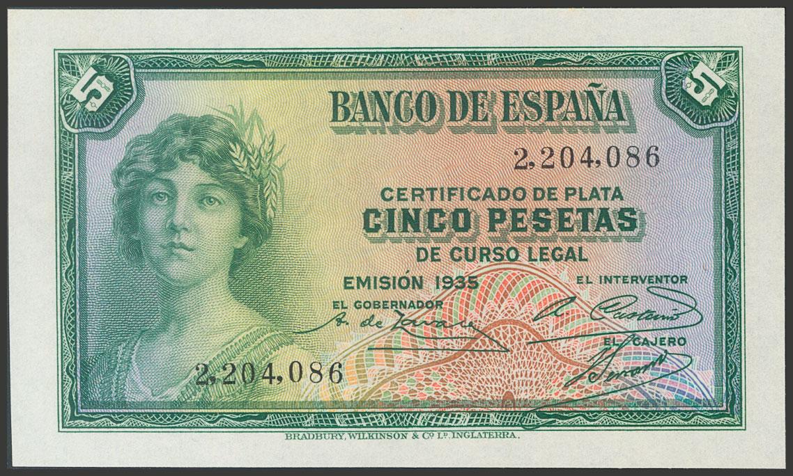 5 Pesetas. 1935. Certificado de Plata. Sin serie. (Edifil 2017: 363). Apresto original. SC-.
