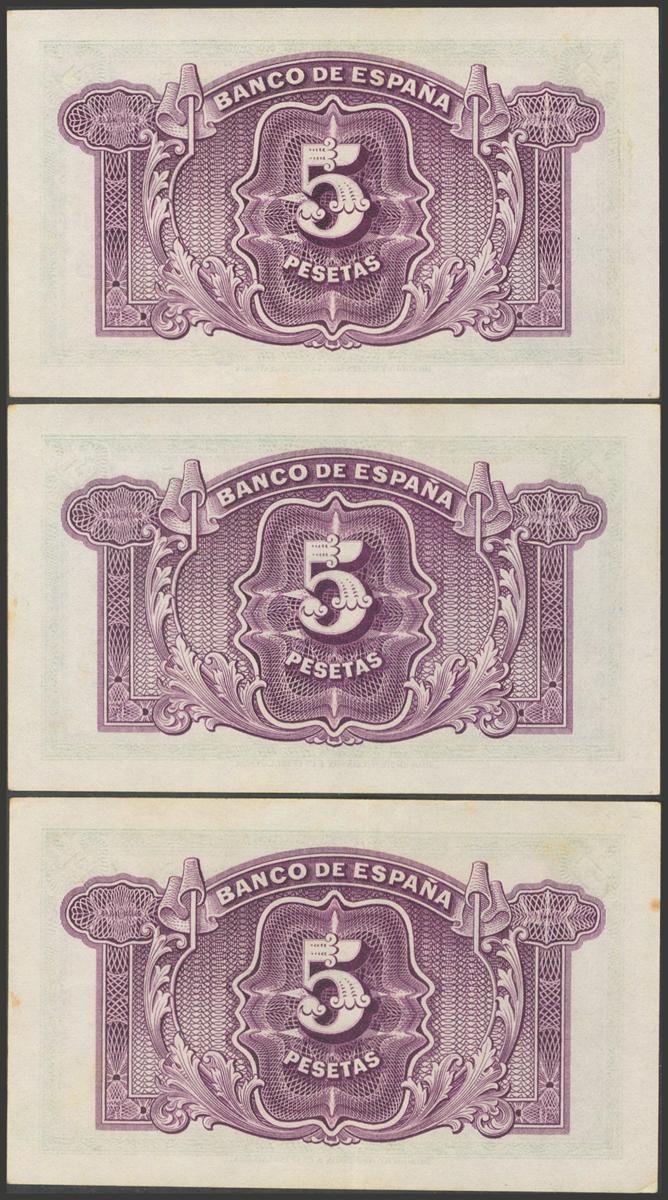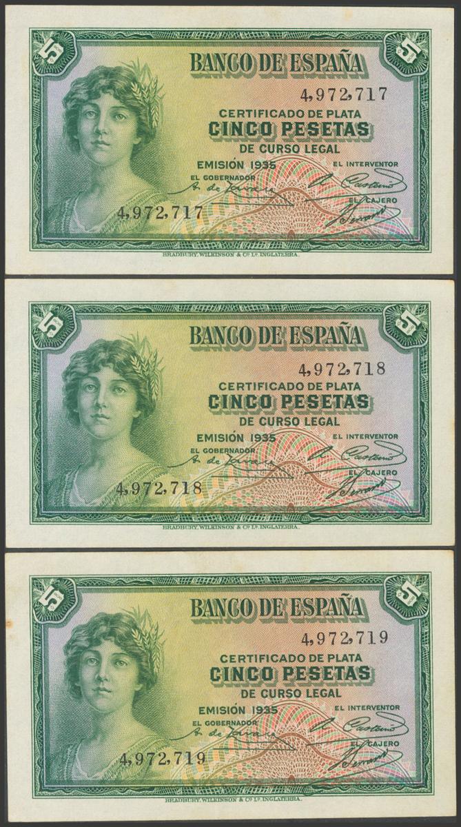 5 Pesetas. 1935. Trío correlativo. Sin serie. (Edifuil 2017: 363). Conserva todo su apresto original. EBC+.