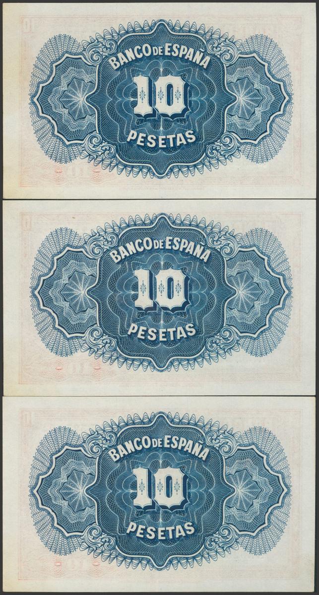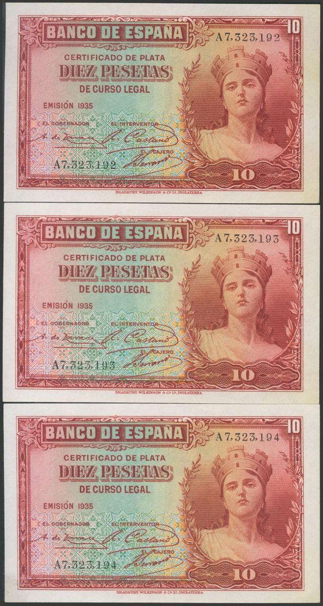 10 Pesetas. 1935. Certificado de Plata. Trío correlativo. Serie A. (Edifil 2017: 364a). Conserva todo su apresto original. SC-.