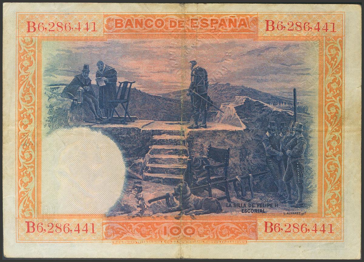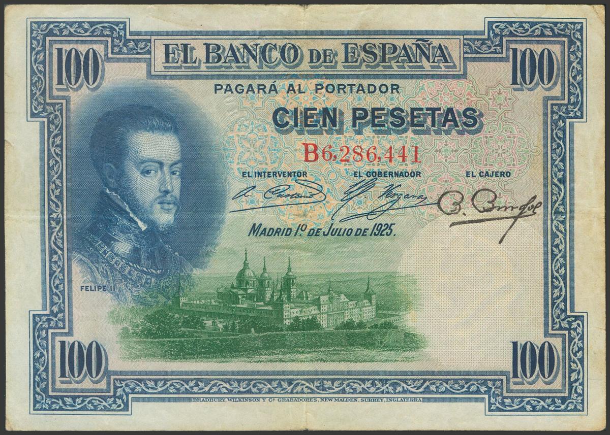 100 Pesetas. 1 de Julio de 1925. Sello en seco "Estado Español, Burgos". Serie B. (Edifil 2017: 410). MBC.