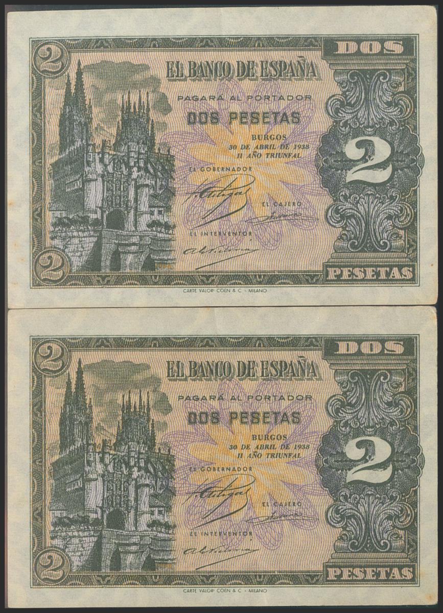 2 Pesetas. 30 de Abril de 1938. Pareja correlativa. Serie L. (Edifil 2017: 429a). Conserva gran parte del apresto original. EBC+.