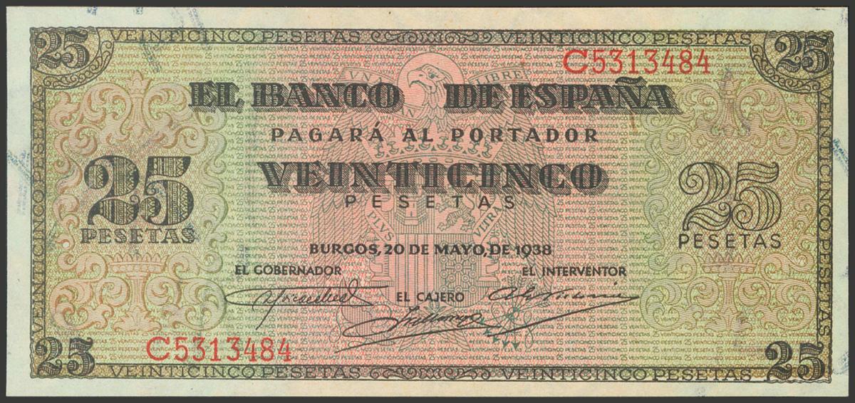 25 Pesetas. 20 de Mayo de 1938. Serie C. (Edifil 2017: 430a). Conserva parte de su apresto original, invisible ondulación. EBC+.