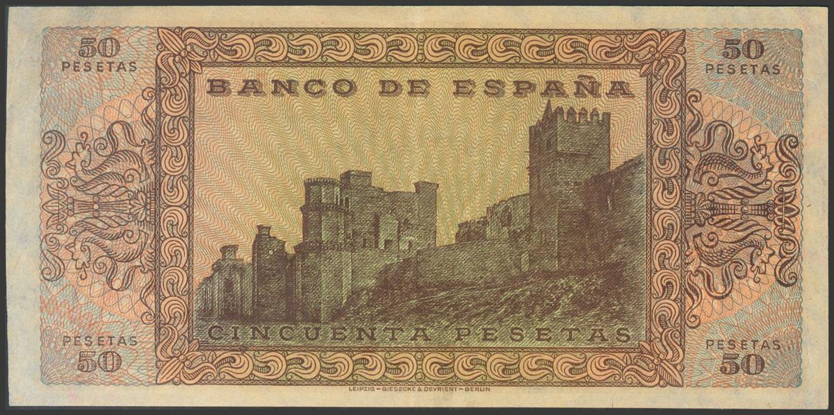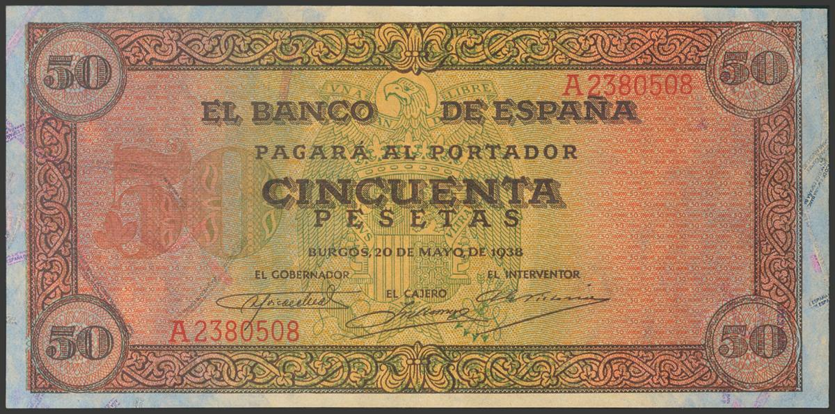 50 Pesetas. 20 de Mayo de 1938. Serie A. (Edifil 2017: 431). Conserva gran parte del apresto original. EBC+.