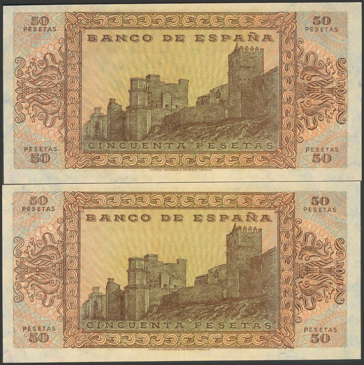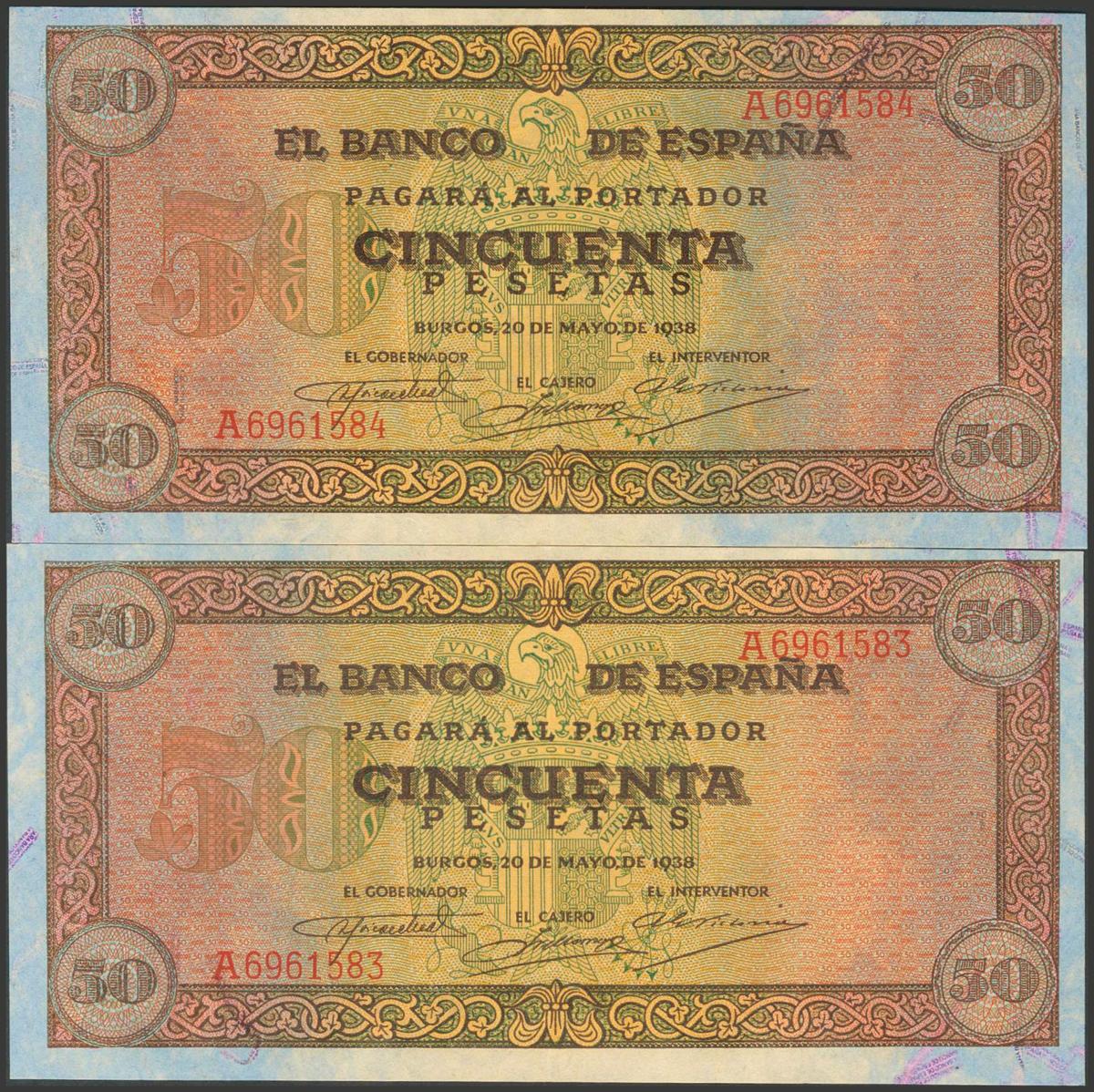 50 Pesetas. 20 de Mayo de 1938. Pareja correlativa. Serie A. (Edifil 2017: 431). Conserva todo su apresto original. EBC+.