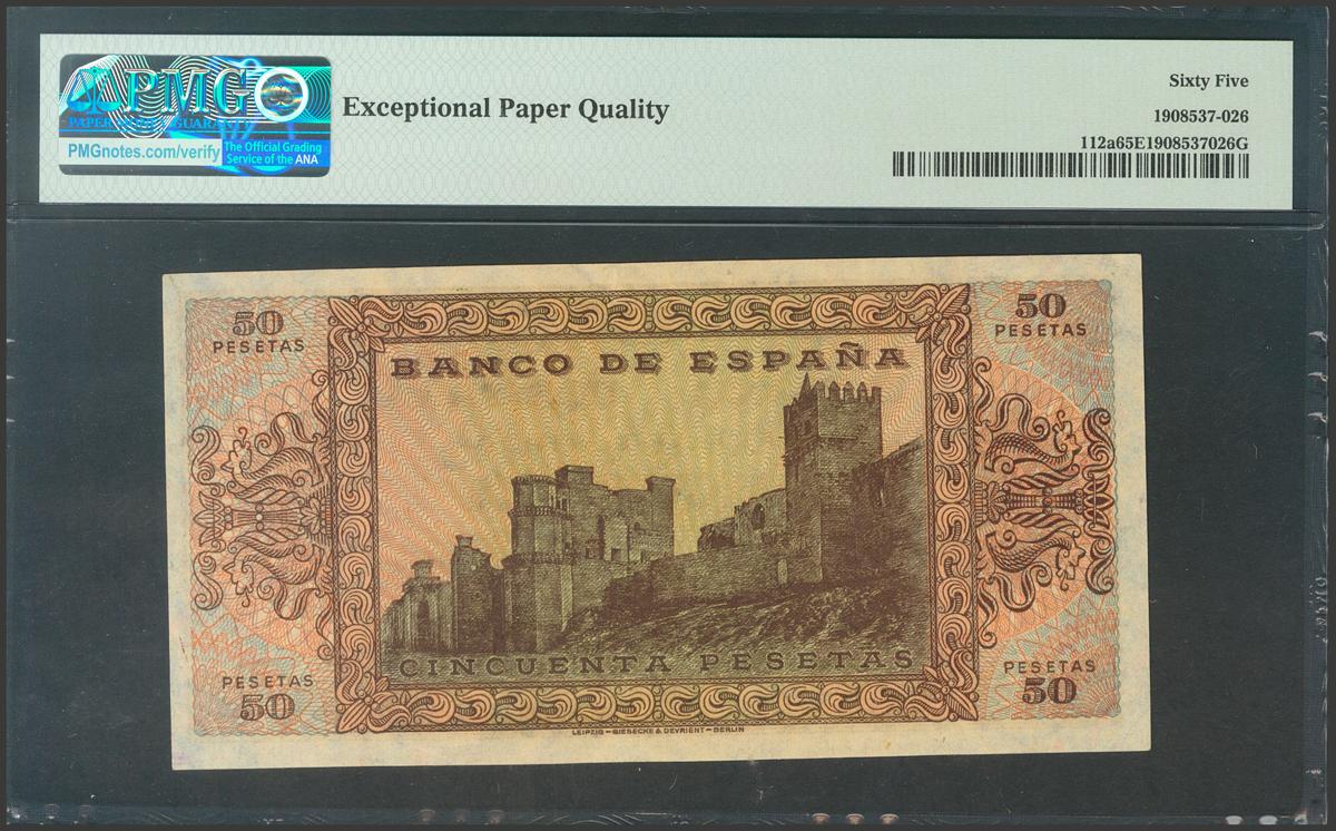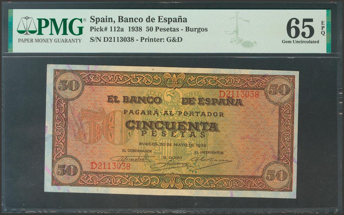 50 Pesetas. 20 de Mayo de 1938. Serie D. (Edifil 2017: 431a). Conserva todo su apresto original. SC. Encapsulado PMG65EPQ.