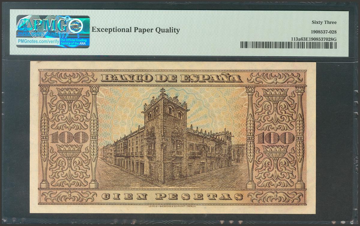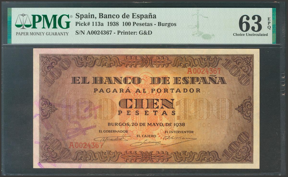 100 Pesetas. 20 de Mayo de 1938. Serie A. (Edifil 2017: 432). Apresto original. SC. Encapsulado PMG63EPQ.