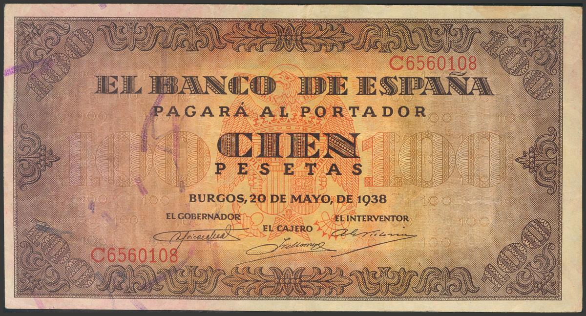 100 Pesetas. 20 de Mayo de 1938. Serie C. (Edifil 2017: 432a). Conserva parte del apresto original. EBC.