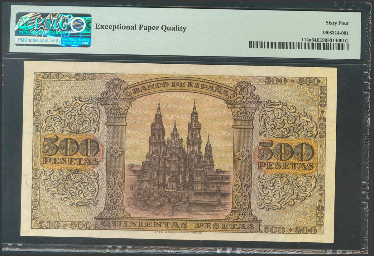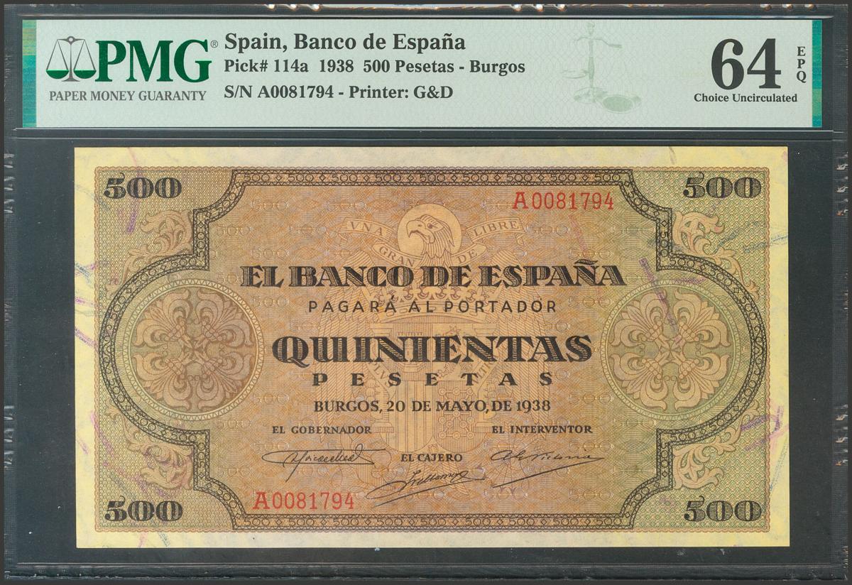 500 Pesetas. 20 de Mayo de 1938. Serie A. (Edifil 2017: 433). Muy raro en esta excepcional calidad, apresto original. SC. Encapsulado PMG64EPQ.