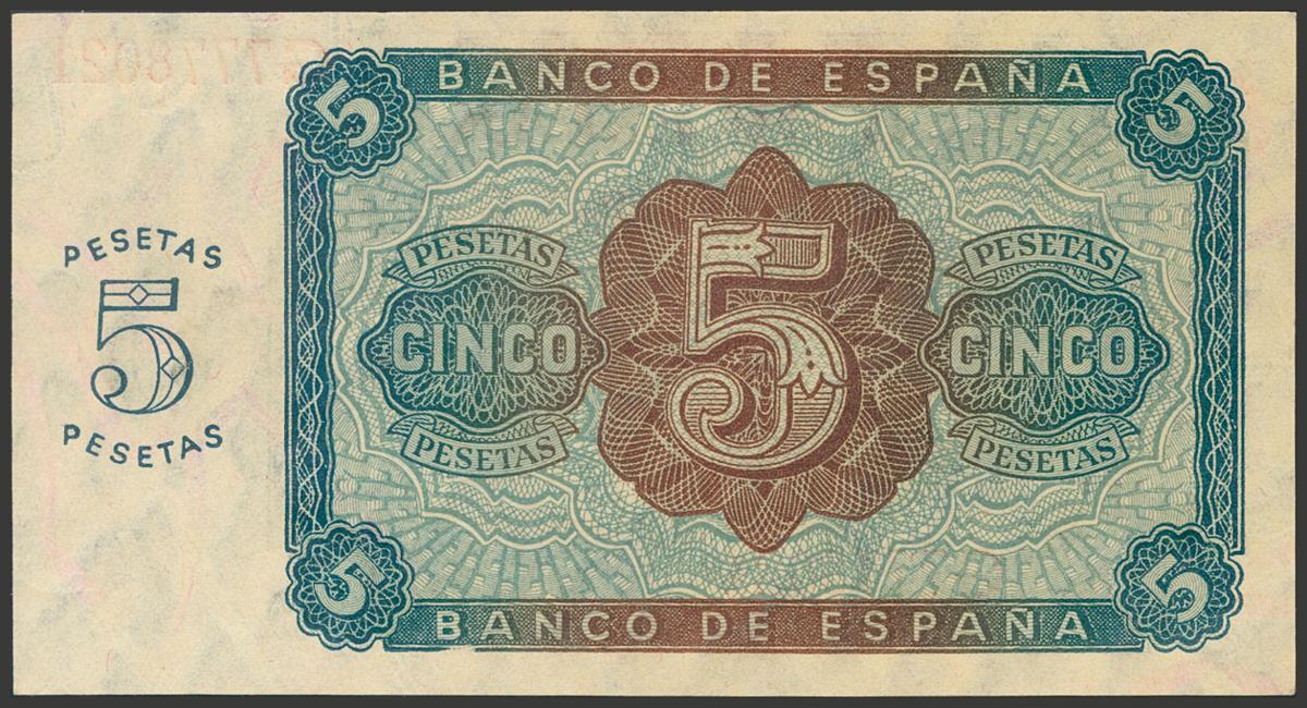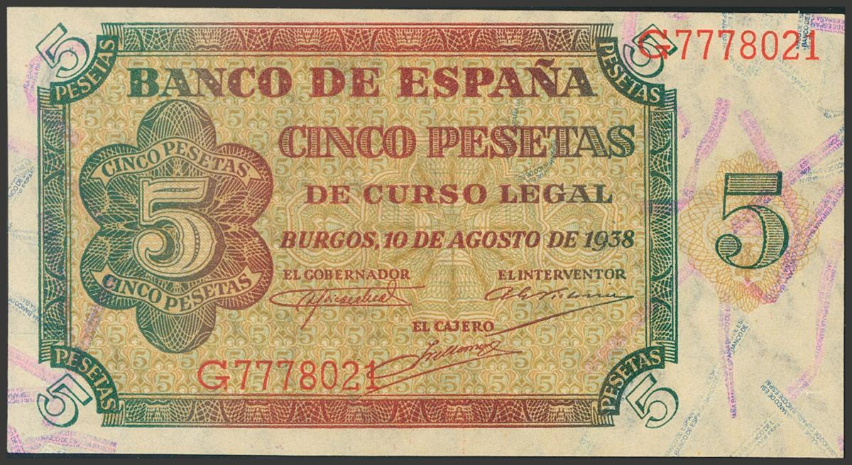 5 Pesetas. 10 de Agosto de 1938. Serie G. (Edifil 2017: 435a). Apresto original. SC.