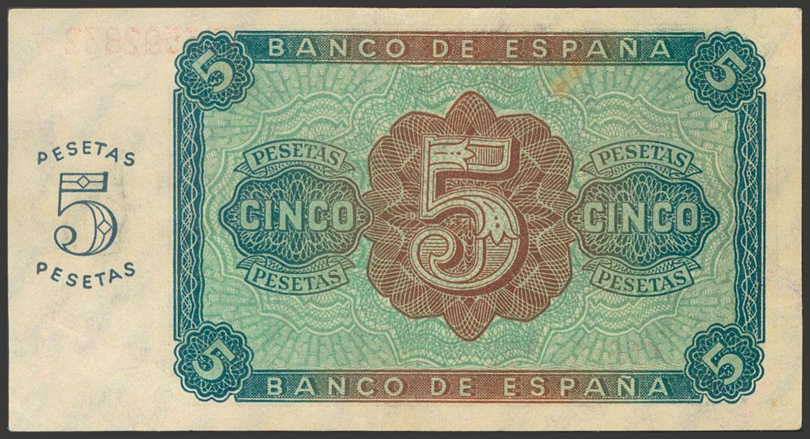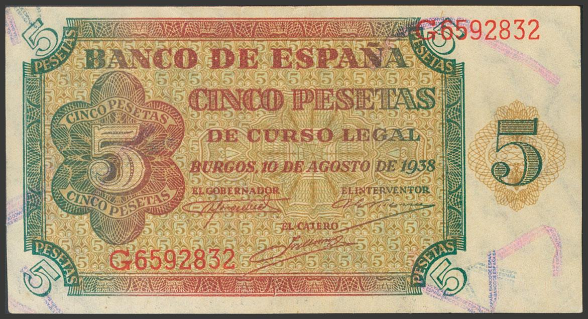 5 Pesetas. 10 de Agosto de 1938. Serie G. (Edifil 2021: 435a). Apresto original, arruguitas naturales del papel (este es el motivo de "quitarle" el SC). EBC+.