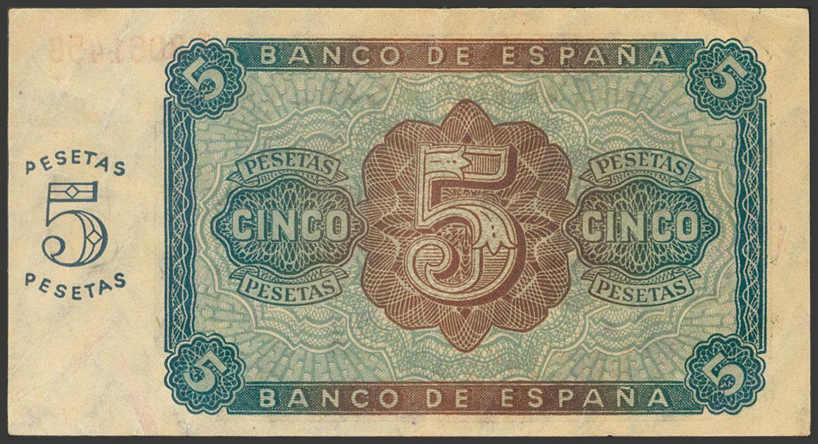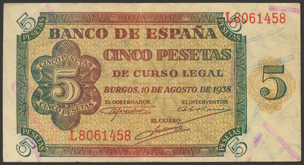 5 Pesetas. 10 de Agosto de 1938. Serie L. (Edifil 2017: 435a). Conserva parte del apresto original. EBC.