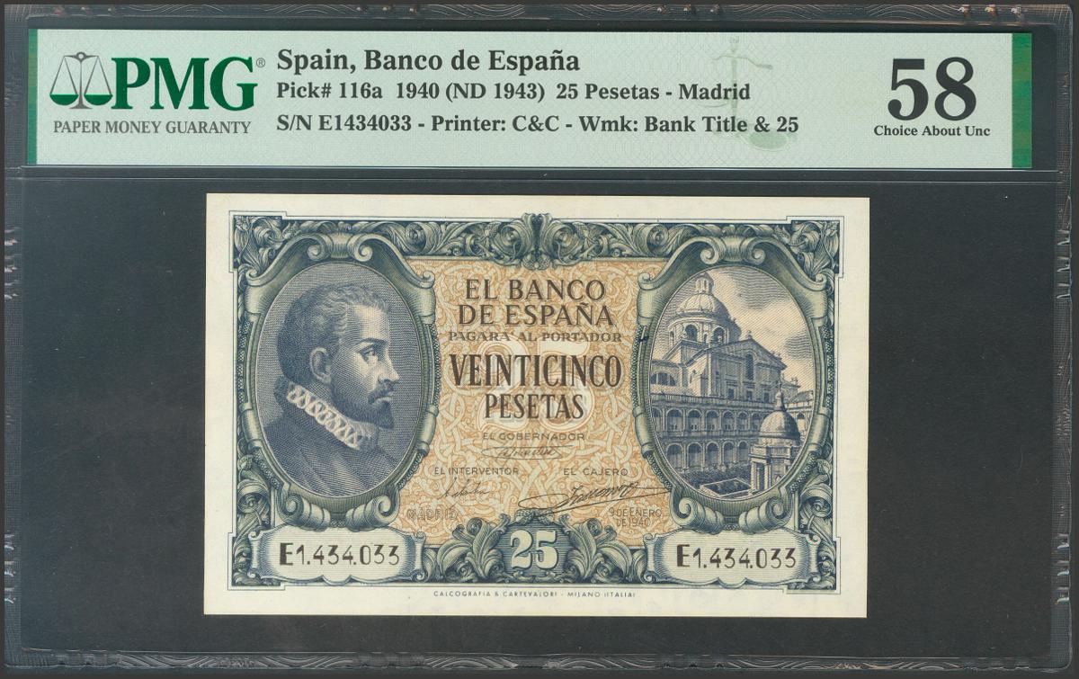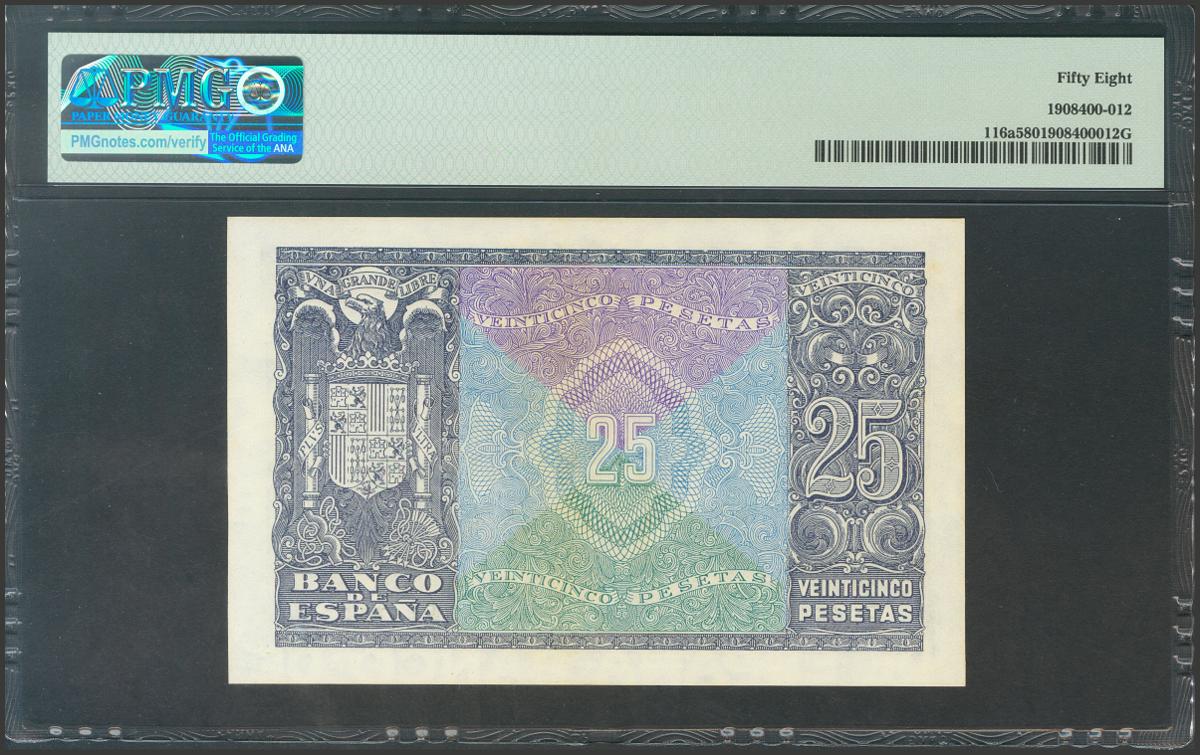 25 Pesetas. 9 de Enero de 1940. Serie E. (Edifil 2017: 436a). EBC+. Encapsulado PMG58.