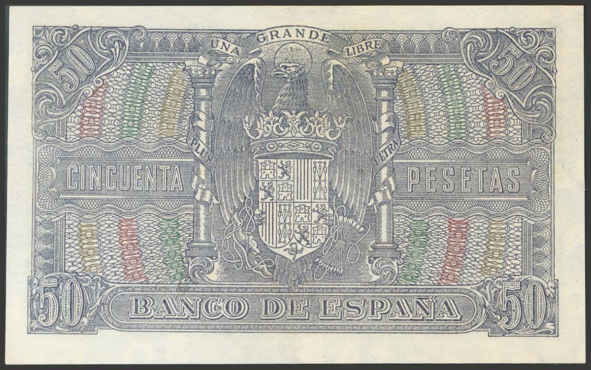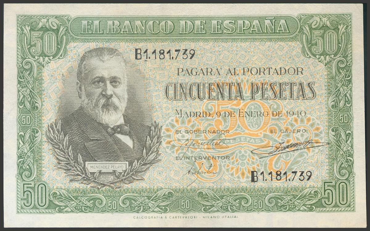 50 Pesetas. 9 de Enero de 1940. Serie B. (Edifil 2017: 437a). Almidonado, muy buena presencia. MBC+.